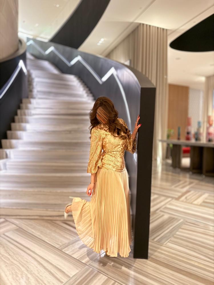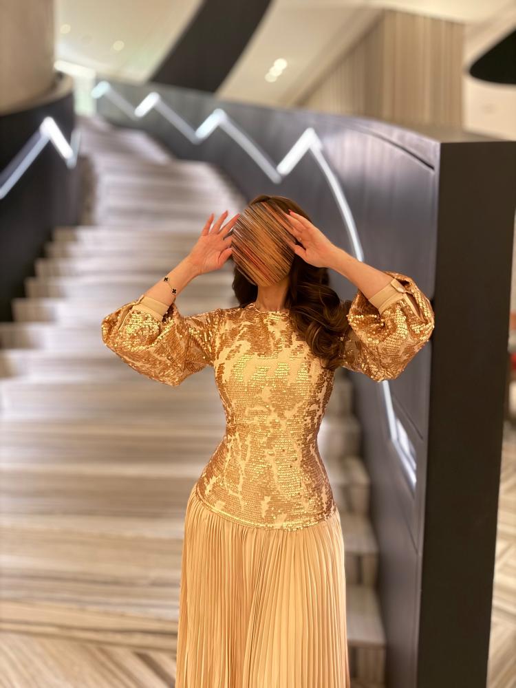 فستان ليّا بتصميم فخم باللون الشامبين الذهبي المتدرّج، يجمع بين بريق الترتر وأناقة الشيفون البليسيه في تناغم يعبّر عن فخامة رافيلا الهادئة، الجزء العلوي مصنوع من قماش ترتر فاخر بتصميم محدّد عند الخصر لإبراز القوام بانسيابية راقية، وتكمّله أكمام منفوخة تزيد الإطلالة اناقةً، أما التنورة فمصنوعة من شيفون بليسيه حريري خفيف بلون ذهبي دافئ يتحرّك بانسيابية فاخرة مع كل خطوة، لتكتمل الإطلالة بتفاصيل دقيقة في الخياطة وسحّاب خلفي مخفي يمنح سهولة في الارتداء ومظهرًا أنيقًا متكاملًا، تصميم يعكس التوازن بين اللمعان والنعومة بأسلوب عملي وفخم يناسب مناسبات المساء الراقية.