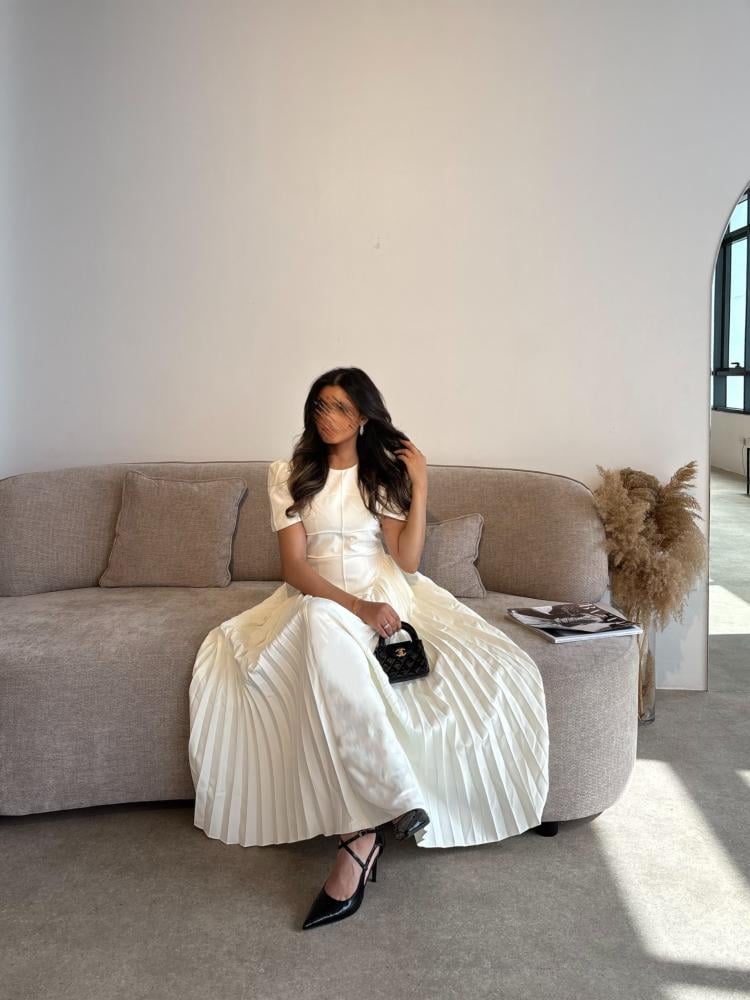 يجسد فستان رونق المعنى الحقيقي للأناقة الراقية والأنوثة الناعمة، بتصميمه الأبيض الساحر وتفاصيله المتقنة التي تبرز جمال القوام وتمنح الإطلالة لمسة من الفخامة الكلاسيكية، حيث يأتي هذا الفستان ليجمع بين البساطة والرقي في آنٍ واحد، بدءًا من قصّته الضيقة في الجزء العلوي التي تبرز جمال الجسم، مرورًا بخطوط الخياطة الطولية التي تضيف لمسة فنية راقية، وصولًا إلى الأكمام القصيرة المنتفخة برقة عند الكتفين والتي تمنح حضورًا أنثويًا متكاملًا، أما تنورته الميدي المصممة بقصة كلوش واسعة وبطيات بليسيه متناسقة، فتضفي حركة وانسيابية جذابة تجعل من كل خطوة إطلالة متميزة وفريدة.