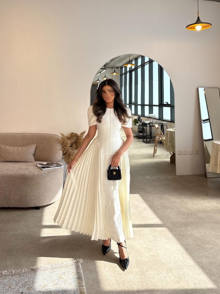 - اللون الأبيض يمنح الفستان طابعًا ناعمًا وراقيًا، كما يضفي إشراقة على الإطلالة ويعكس الذوق الكلاسيكي الرفيع.