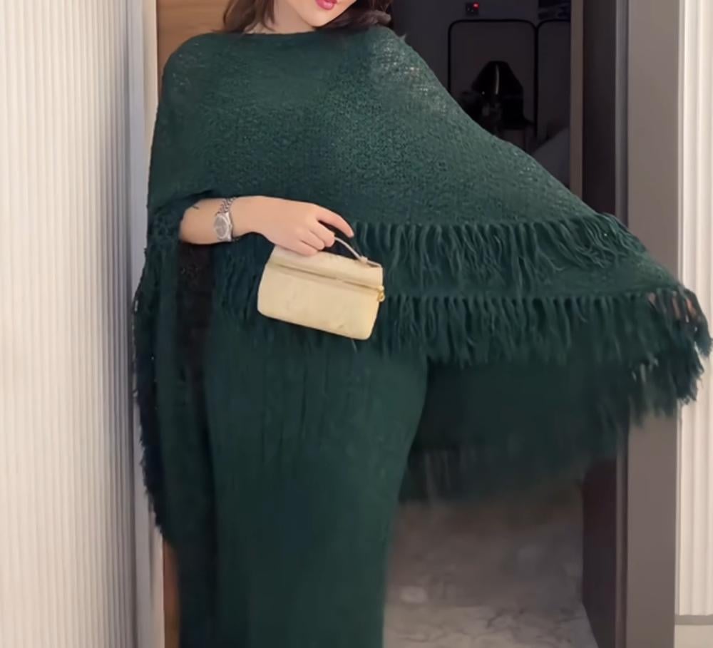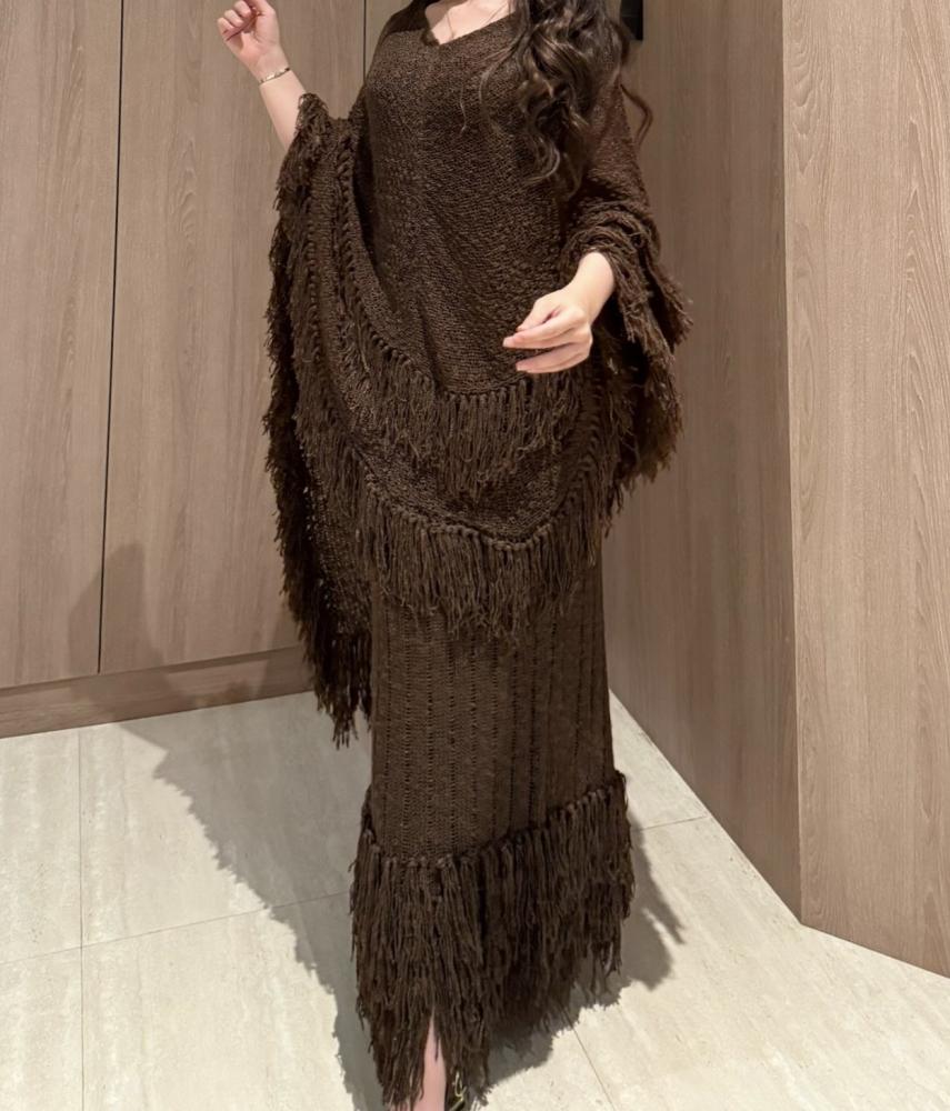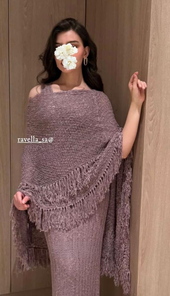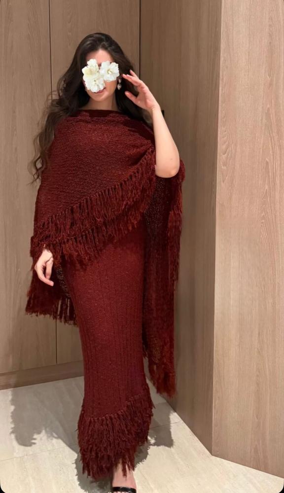 فستان فاخر مصنوع من خيوط الصوف الناعمة بتصميم أنثوي متكامل مكوّن من قطعتين منفصلتين بلوزة فضفاضة بطول متوسط وفستان طويل بنفس النسيج.
