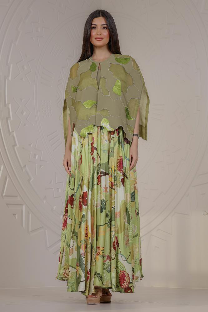 - يجمع التصميم الفاخر بين الكيب المطرز والتوب الناعم والتنورة الكلوش لإطلالة مكتملة وأنيقة تناسب أرقى المناسبات.