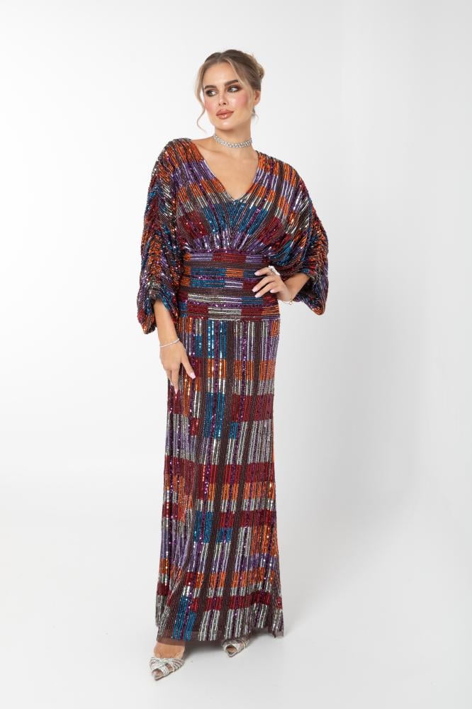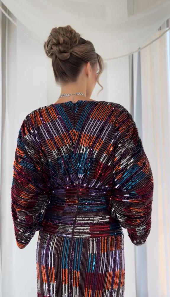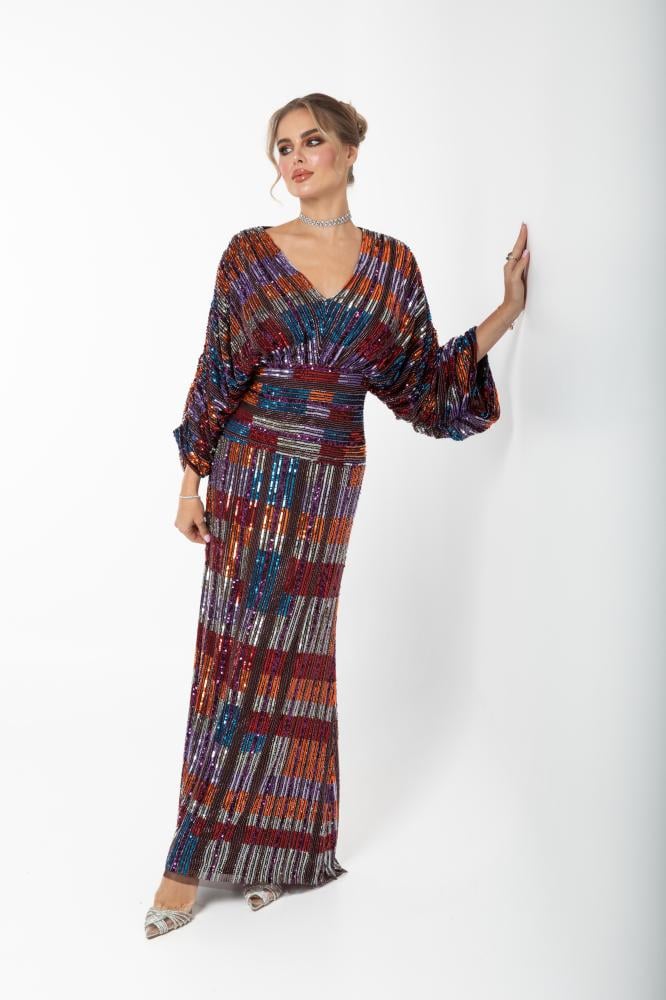 يتميّز الفستان بأنه ثقيل الوزن نتيجة كثافة الشغل اليدوي وتغطية القماش بالكامل بالتطريز، ما يجعله خيارًا فاخرًا لإطلالات السهرة المميّزة، قصّة الأكمام الواسعة مع الخصر المحدد تعطي توازنًا أنيقًا بين الراحة والرقي، فيما ينعكس الضوء على الفستان ليمنحه إشراقة متلألئة من كل زاوية.