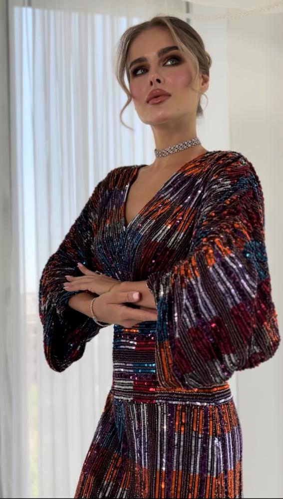فستان سبيشل قطعة استثنائية تعكس الفخامة في كل تفصيلة، صُمّم بخطوط مطرزة بالكامل بالترتر اللامع بألوان متناغمة، وجميع التطريزات تم تنفيذها يدويًا بدقة عالية مما يمنحه لمسة فنية متفردة.