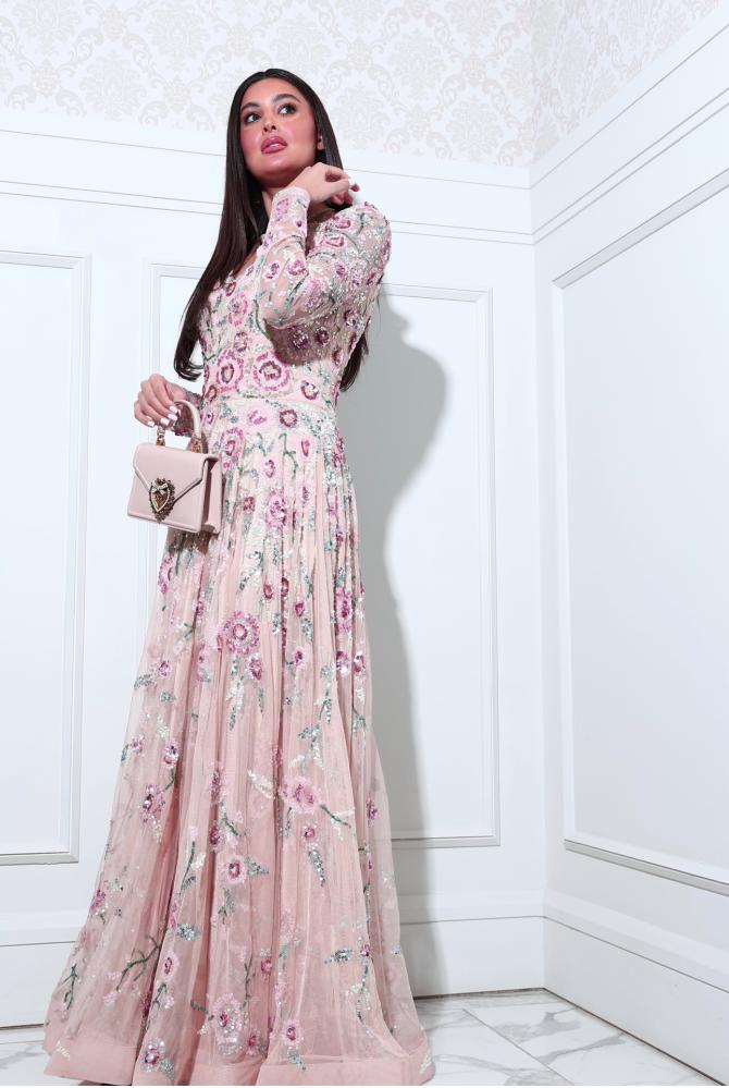 استمتعي بإطلالة كالفراشة مع فستان سهرة وردي بأكمام طويلة مزين بالزهور المقدم من متجر رافيلا أفضل موقع فساتين في السعودية.