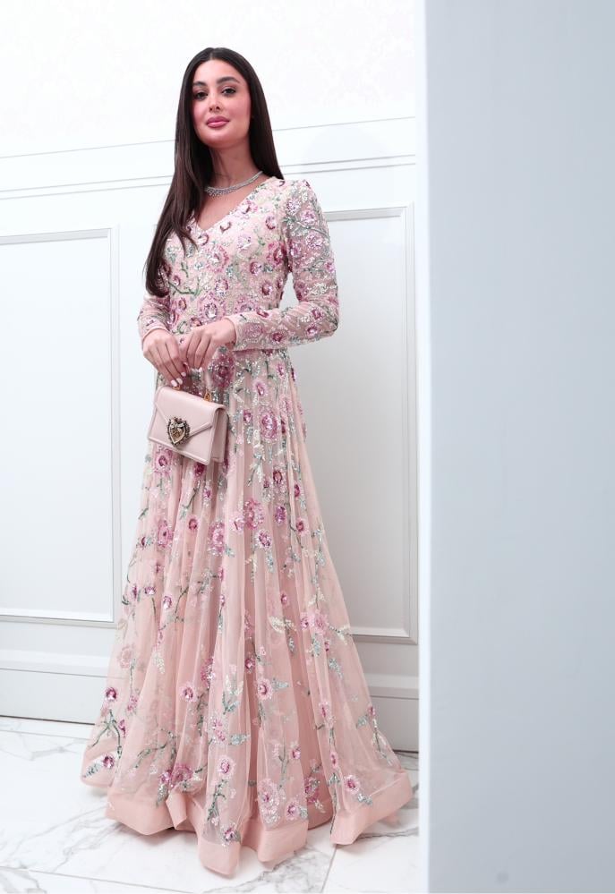 فستان سهرة وردي بأكمام طويلة مزين بالزهور هو تجسيد للأنوثة الناعمة والأناقة الراقية، حيث يتميز بتصميم طويل وانسيابي يمنح القوام مظهرًا جذابًا، مصنوع من قماش التل الشفاف والمطرز بتفاصيل زهرية ملونة تنبض بالحياة، كما أن الأكمام الطويلة والياقة على شكل حرف V تضيف لمسة كلاسيكية مفعمة بالنعومة، بينما يضفي تناغم الألوان الزهرية، مثل الوردي والتيفاني والأبيض، سحرًا خاصًا يعكس الذوق الرفيع. هذا الفستان مثالي للمناسبات الرسمية والسهرات التي تتطلب حضورًا أنيقًا ومميزًا لا يُنسى.
