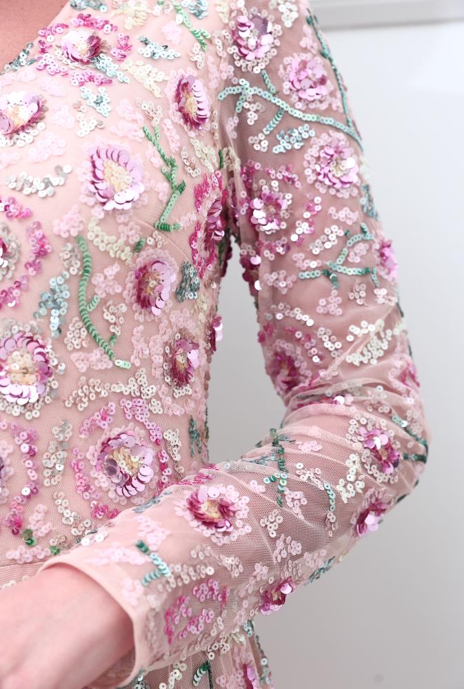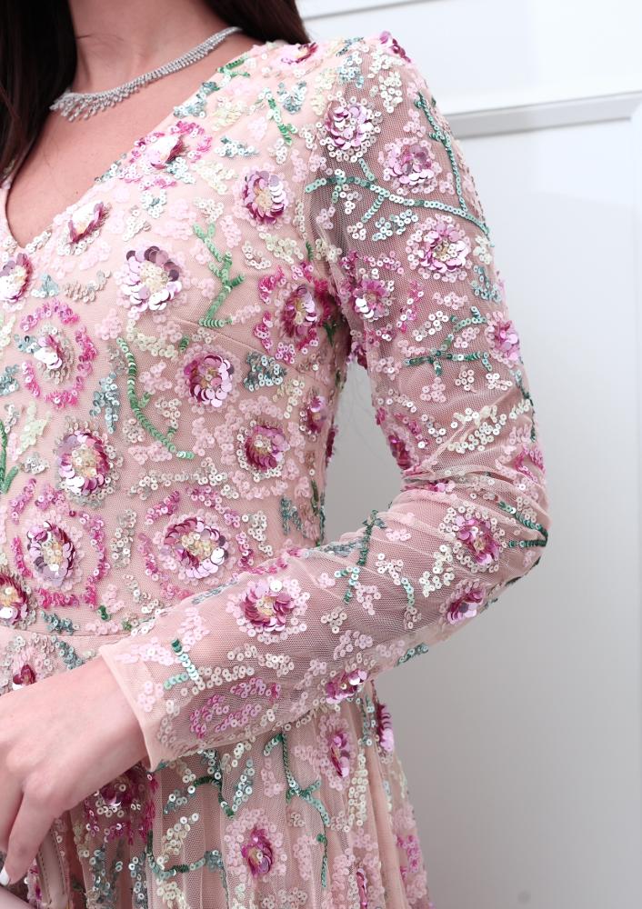 مميزات فستان سهرة وردي بأكمام طويلة مزين بالزهور