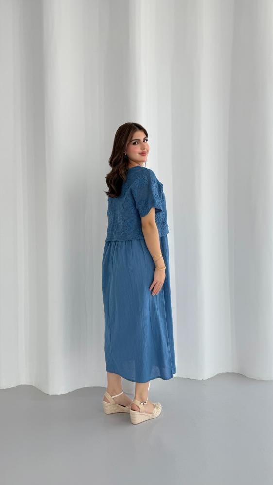 - الموديل والتصميم: الجزء العلوي من الكروشيه المميز بنقوش زهور ناعمة، مبطن من الداخل بخامة قطنية لضمان الراحة، أما الجزء السفلي، فينحدر بقماش اللينن الخفيف والمنسدل، ليمنح الفستان إحساسًا بالانتعاش والنعومة.
