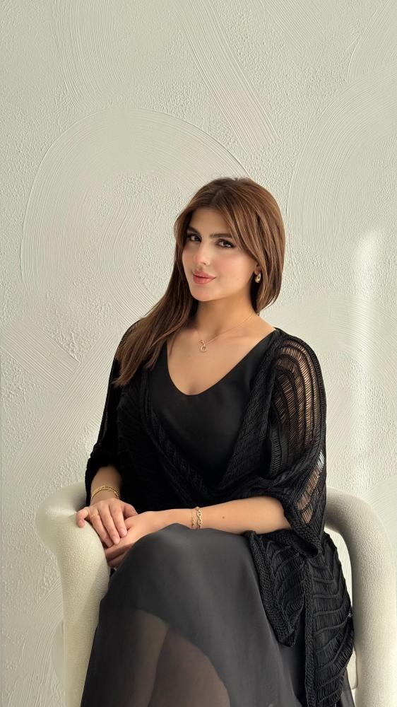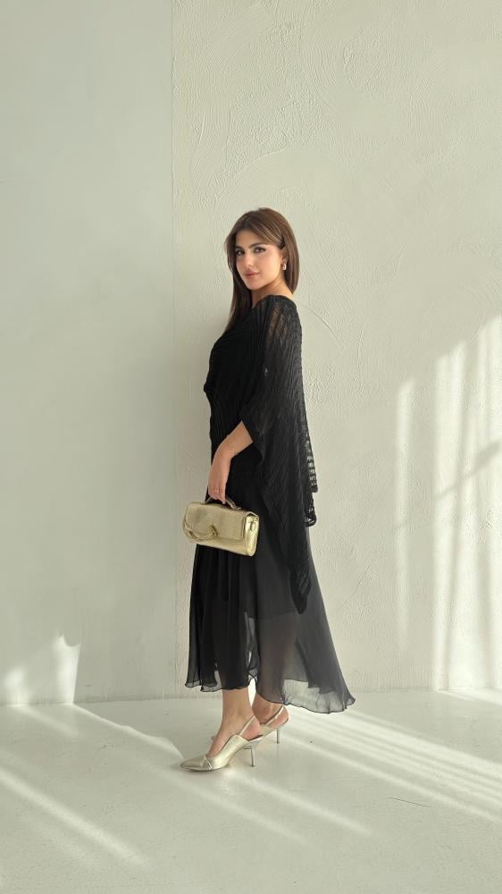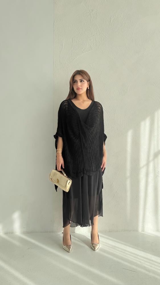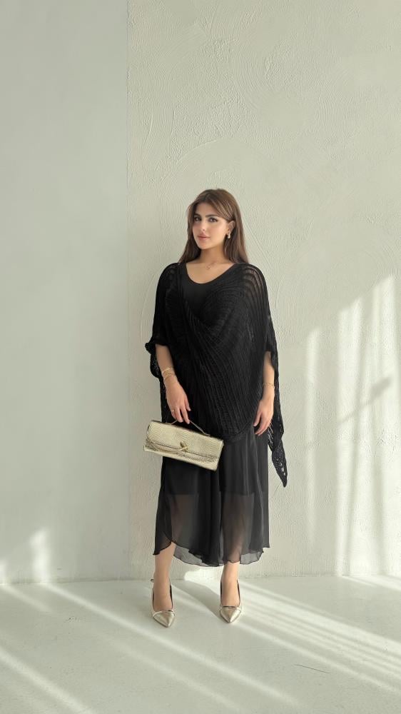 طقم أنيق ومريح يتكون من فستان شيفون حرير بلون زيتي ناعم، مبطّن من الداخل بطبقة قطنية خفيفة لضمان الراحة، يتميز الفستان بقصة كلوش ميدي واسعة وانسيابية تمنحك حرية في الحركة وأناقة في الإطلالة، يُكمَّل الطقم ببلوزة كروشيه منسوجة بخيوط قطنية بنمط مفتوح، تضيف لمسة فنية عصرية وتغطي الأكتاف بأسلوب ناعم وأنيق.