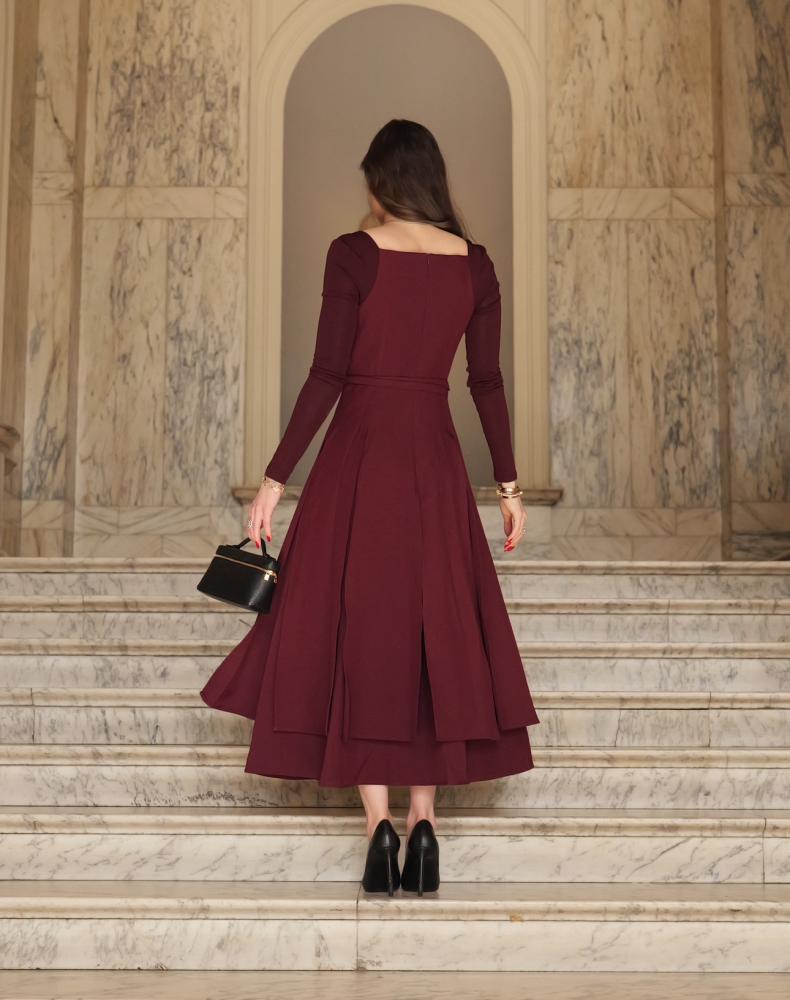 - الموديل والتصميم: تصميم كلاسيكي مع ياقة مربعة وأكمام طويلة ضيقة مصنوعة من قماش السترتش تضيف لمسة من الأناقة والرقي، التصميم محدد الخصر بحزام ناعم من نفس القماش، مما يبرز جمال القوام، بينما يمتد التنورة بشكل واسع قليلاً ليصل إلى طول ميدي.