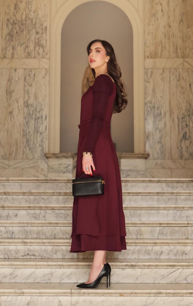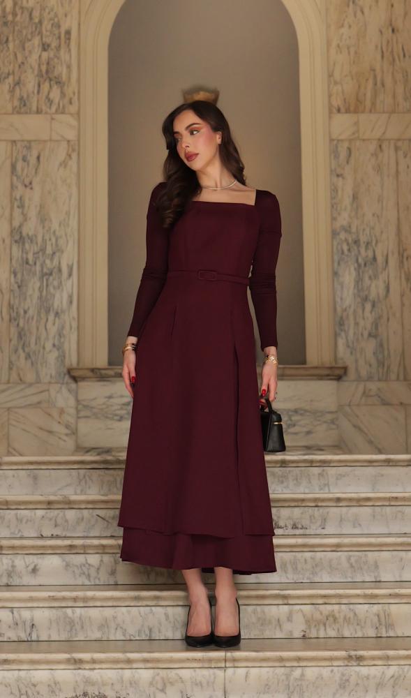 - يأتي الفستان بلون أنثوي عميق يعكس الفخامة والدفء، مما يجعله مثاليًا للمناسبات المسائية أو الإطلالات الراقية.