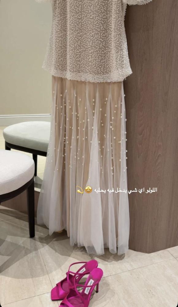 - الموديل والتصميم: تصميم انسيابي، يتميز الجزء العلوي بخامة محبوكة فاخرة مطرزة بالكامل بحبيبات اللؤلؤ الصغيرة، مع أكمام قصيرة منفوشة تضيف لمسة عصرية مميزة، أما التنورة فهي مصممة من التول الشفاف المبطن ببطانة بيج ناعمة، وتتميز بطبقات خفيفة مرصعة بلآلئ متناثرة بعناية.